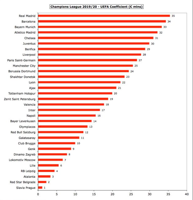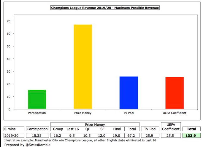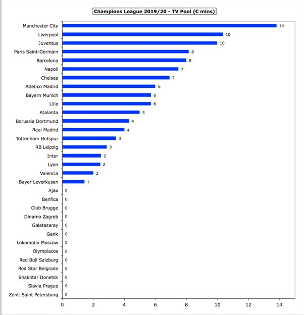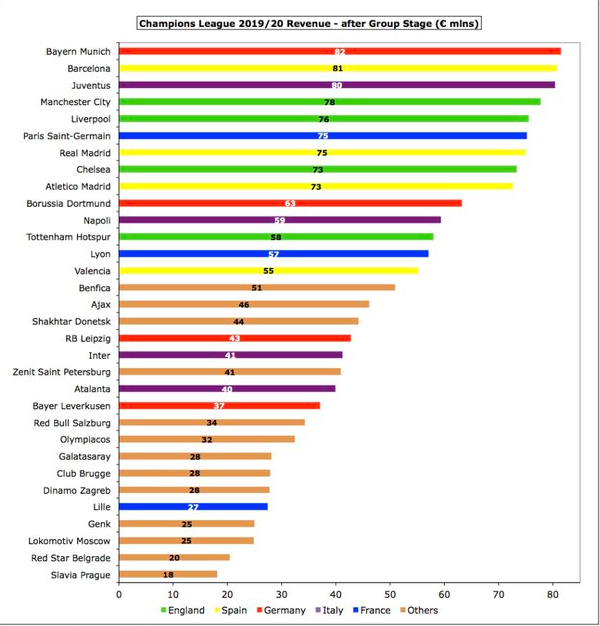 2019/20赛季欧冠小组赛阶段已经结束。一家名为Swiss Ramble的瑞士媒体盘点了32强在小组赛阶段从欧冠这项赛事中所获得的奖金。其中,拜仁获得8200万欧元位居第一,巴萨、尤文紧分列二、三位。
