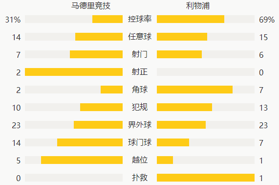 上半场比赛第4分钟马竞取得领先!科雷亚开出右侧角球,球砸在法比尼奥脚上弹到后点,萨乌尔跟进一脚将球打进!马竞主场1-0领先利物浦。