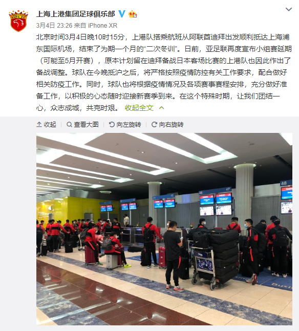 图说:上港月初结束冬训回国 网络截图