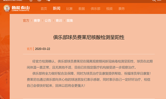 图说:山东鲁能外援费莱尼的核酸检测呈阳性 官方图