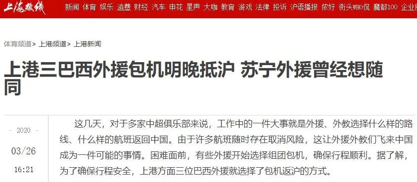 今天上午,上海媒体《上海热线》就报道称,上港队中三名巴西外援,奥斯卡、胡尔克和洛佩斯三人将包机返回上海,预计三人将在明晚抵达。而原本苏宁的外援也想同他们一道返回,不过由于从上海出关到南京还有一系列的政策,因此苏宁外援最终放弃了这一计划,他们正想办法直接飞回南京。《上海热线》同时指出,虽然包机的方式最为方便,不过航线的申报、报备等方面还需要多部门协调。